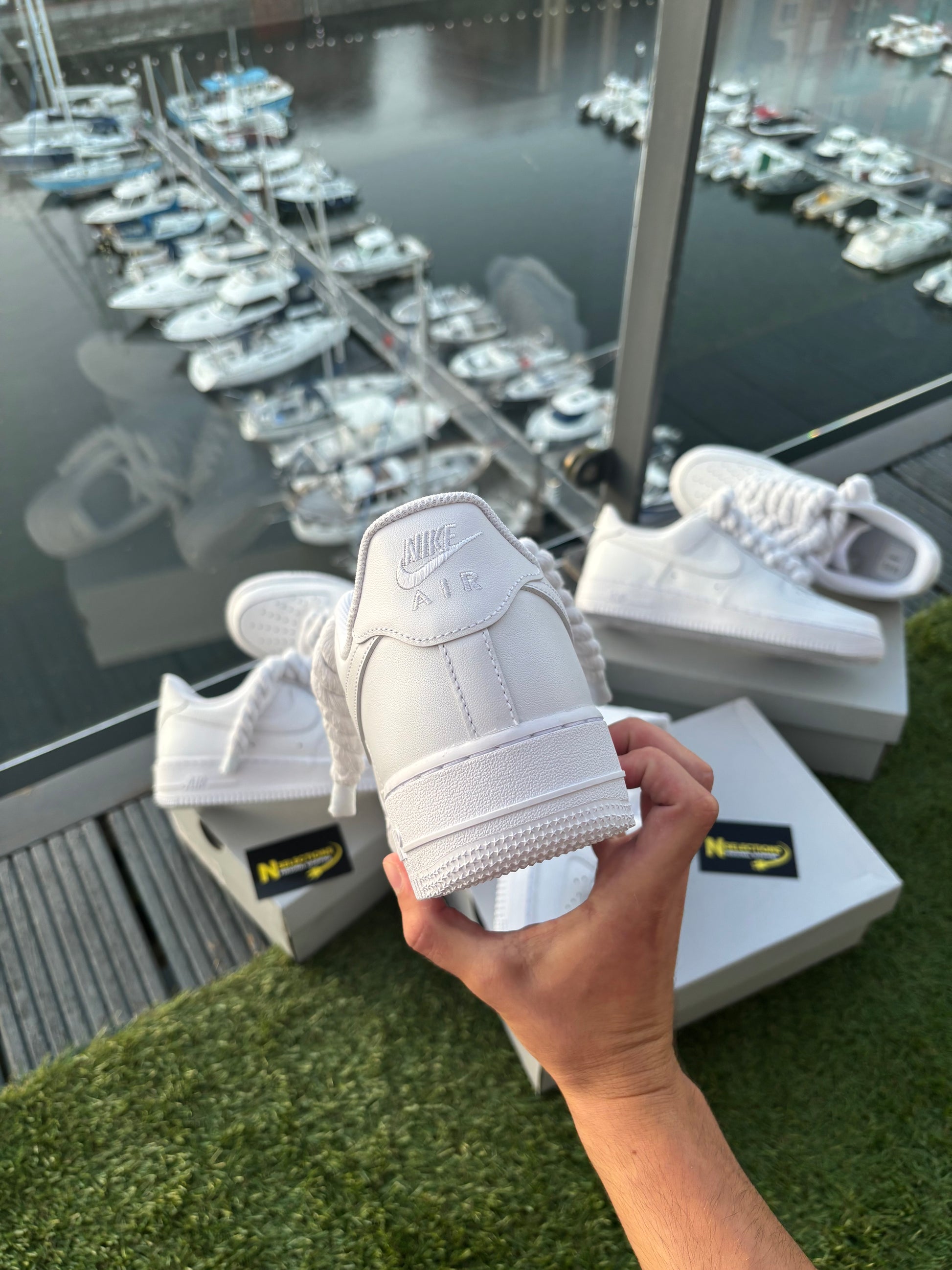 Step up your sneaker game with the iconic Roped AirForce 1 White. A fresh twist on a classic, these timeless kicks combine the legendary AirForce 1 silhouette with an edgy, rope-inspired design that elevates any look. The crisp white leather upper offers a clean and versatile style that pairs effortlessly with any outfit, while the rope detailing on the laces and sides adds a unique touch of texture and sophistication.